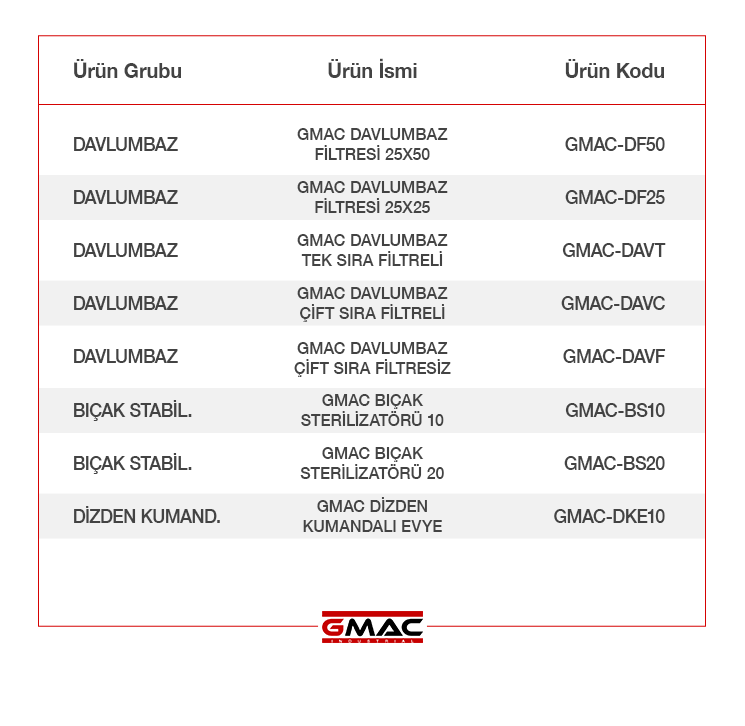 GMAC hijyen grubu; davlumbaz filtreleri, dizden kumandalı evyeler ve bıçak stabilizatörleriyle profesyonel mutfaklarda en yüksek temizlik standartlarını sağlar. Paslanmaz çelik yapıları, kolay temizlenebilir yüzeyleri ve güvenli kullanım tasarımları sayesinde operasyonel hijyeni artırırken, gıda güvenliği süreçlerini mükemmel şekilde destekler. Yoğun mutfak koşullarına dayanıklı bu sistemler, hem verimliliği hem de hijyen kalitesini üst seviyeye taşır.